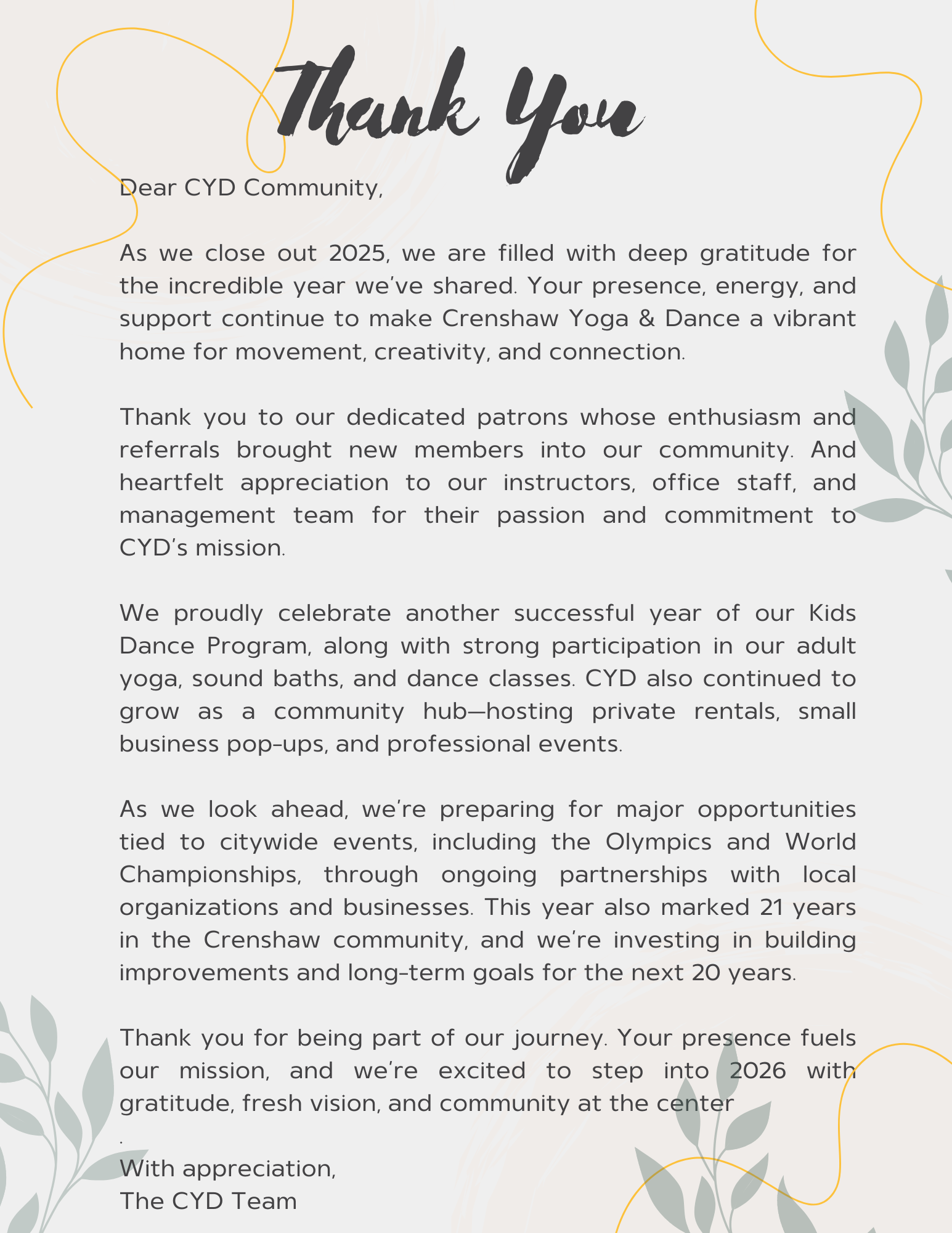 In August 2004, she founded Crenshaw Yoga & Dance, the first yoga studio in the Crenshaw community. Her vision created a space where people could heal, rejuvenate, and connect through yoga and dance, promoting both physical and mental well-being.